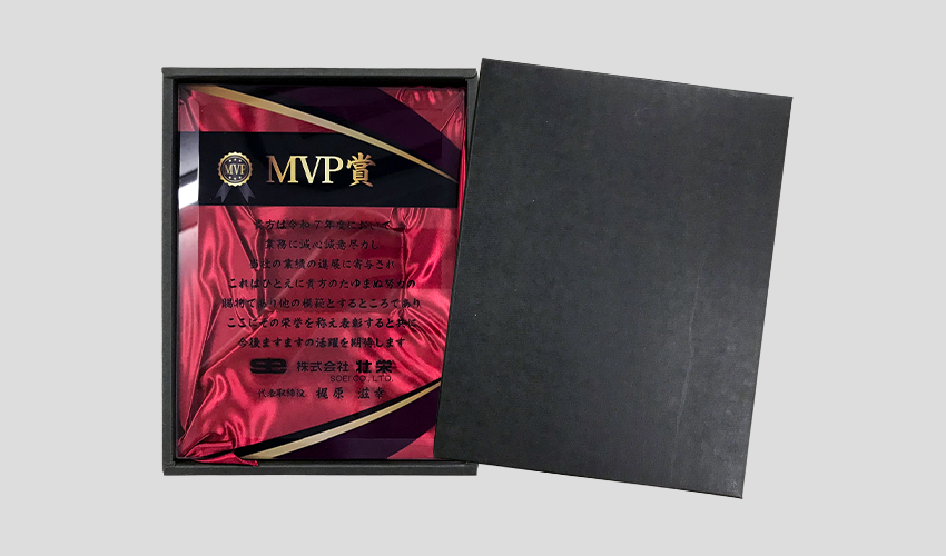 ウルトラホワイトガラスのオリジナル表彰楯を制作させていただきました。化粧箱も含めて高級感が漂います。