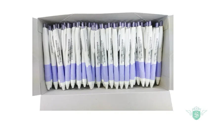 インクジェット印刷でロゴとテキストをプリントしました。ボールペンは、低価格帯で安定した人気を誇る三菱鉛筆のジェットストリームスタンダードです。