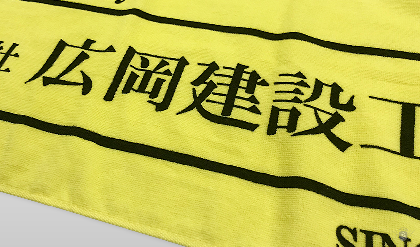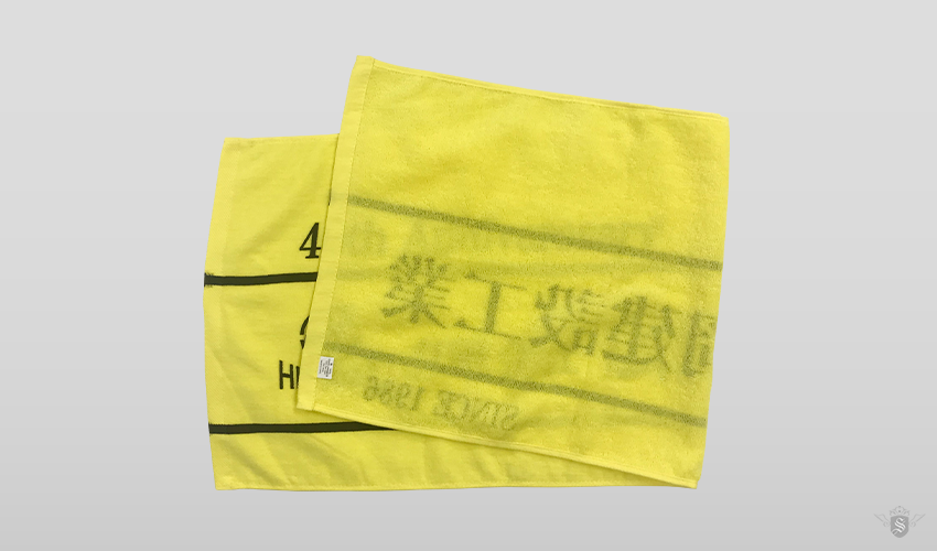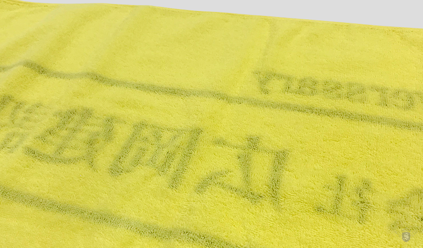 オリジナルタオルを制作させていただきました。シャーリング生地でイエローベースのタオルに黒1色での印刷です。