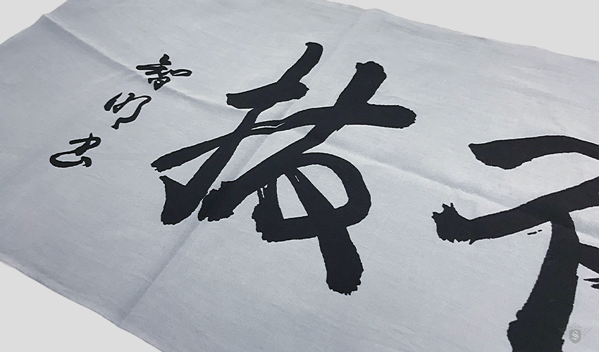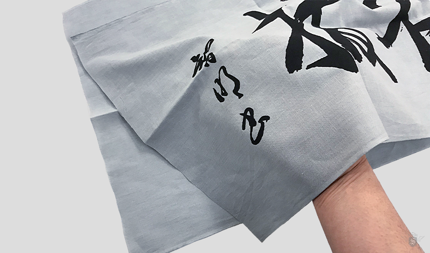 オリジナルの面タオルを制作させていただきました。岡生地に顔料を使い白抜きで染めています。