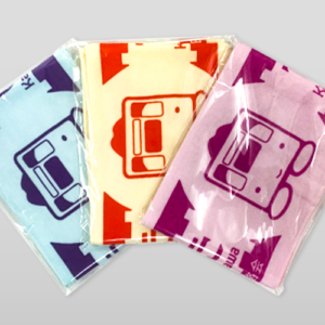 オリジナルのマフラータオルを制作させていただきました。ライトブルー、ライトピンク、ライトイエローの3色、個包装袋入です。