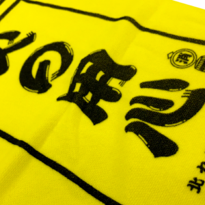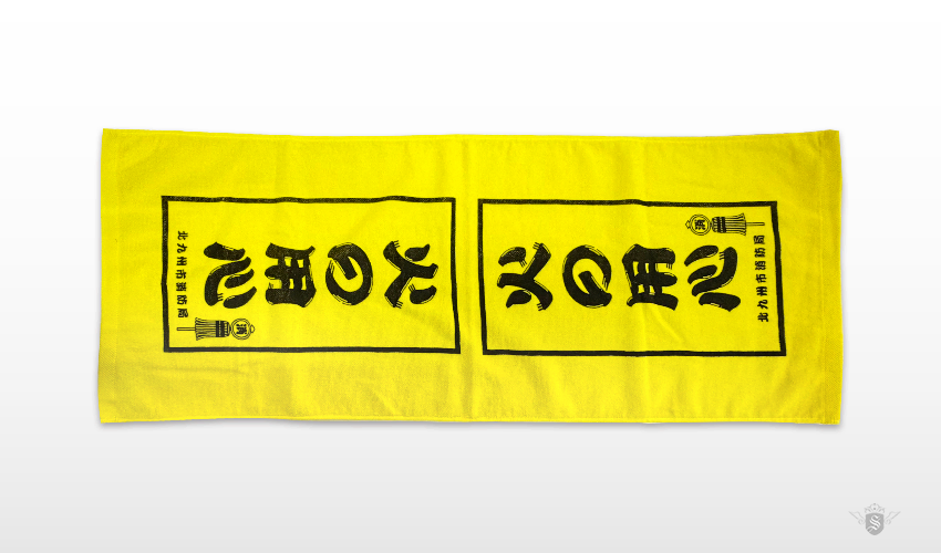 オリジナルタオルを制作させていただきました。イエローベースのシャーリング生地のタオルに黒1色での印刷です。