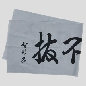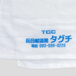 オリジナルの面タオルを制作させていただきました。岡生地・エンジ色に白抜き文字の手捺染・切りっぱなし仕様で制作しています。