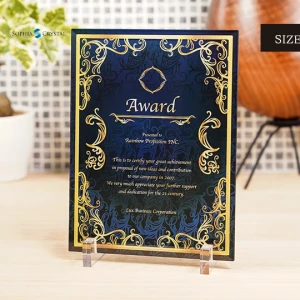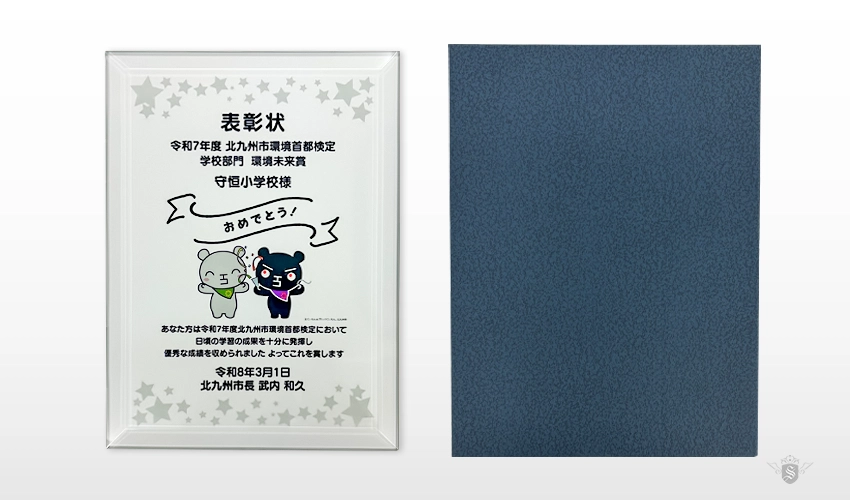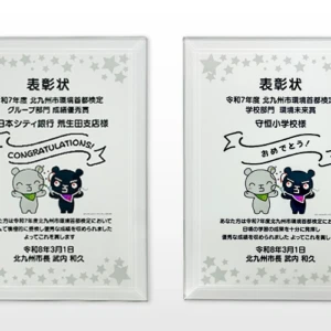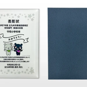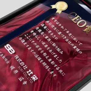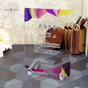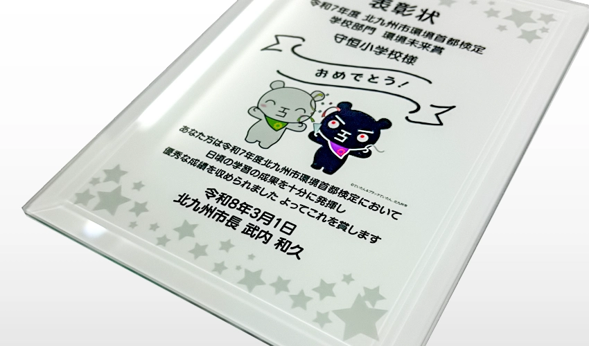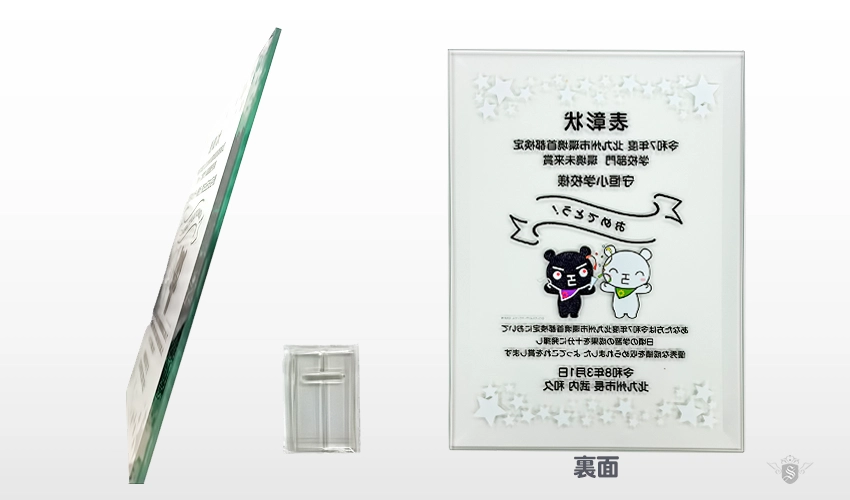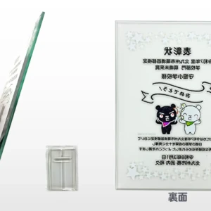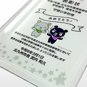 オリジナルのクリスタル表彰楯を制作させていただきました。サイズ170×230mm、UVカラー印刷で制作しています。