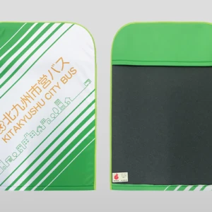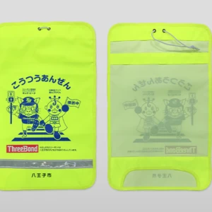 蛍光生地と反射材付きのランドセルカバーに絵柄と市名を印刷させていただきました。