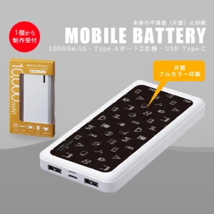 オリジナルのモバイルバッテリーを制作させていただきました。10000mAhの大容量、片面1色印刷で制作しています。