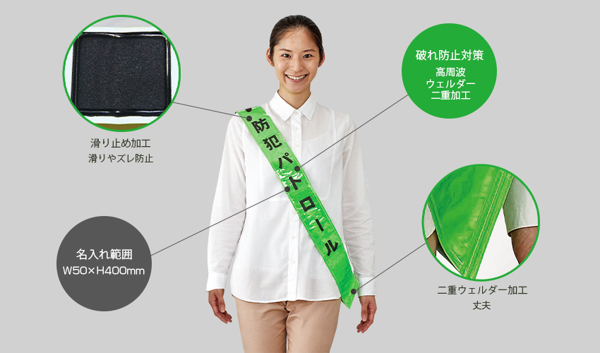全面反射タスキです。高輝度マイクロプリズム反射材を使用し、全面反射で昼夜問わず高い視認性を発揮します。交通安全・事故防止・夜間の見回りパトロールなどに。軽量で、服の上から簡単に装着できるのもタスキのメリットです。