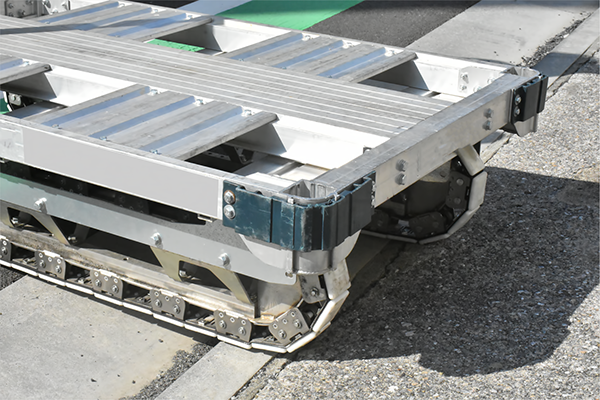 既にお使いのキャスター平床台車に、付属の部材で簡単に取り付けられる台車用クローラです。圧倒的な走破性と積載能力で、これまで困難だった不整地や被災地での運搬作業を劇的に変革します。段差、配筋の上でも、安定した走行で大切な荷物を安全に運びます。