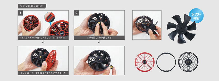 フィンガーガードだけでなく、プロペラ部分も取り外しが可能です。プロペラは水洗いが可能なので、ファンを清潔に保つことができます。水洗い後はしっかり乾かしてから取り付けてください。