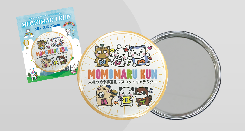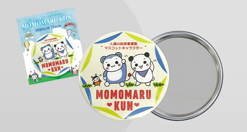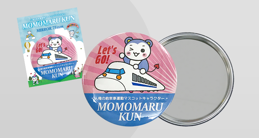 北九州市人権の約束事運動マスコットキャラクター「モモマルくん」のミラー缶バッジです。裏面は鏡になっています。サイズはφ75mm。デザインは当店オリジナル。ちょっとしたプレゼントやお土産に便利なグッズです。
