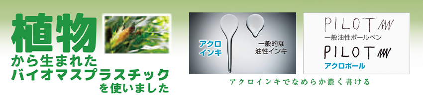 植物由来のプラスチック「バイオマスプラスチック」を使用した「なめらかアクロインキ搭載」パイロットのノック式油性ボールペンです。オプションで、紙製の専用スリーブもご用意しています。