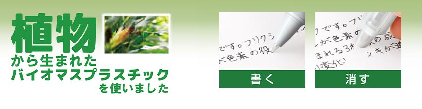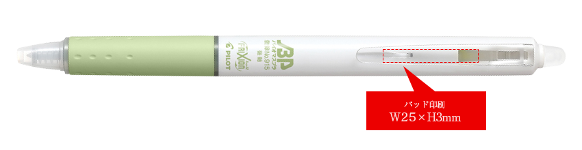 植物由来のプラスチック「バイオマスプラスチック」を使用した「筆跡が乾いてからペン上部のラバーでこすると色が消える」パイロットのクリップスライドノック式ボールペンです。オプションで、紙製の専用スリーブもご用意しています。