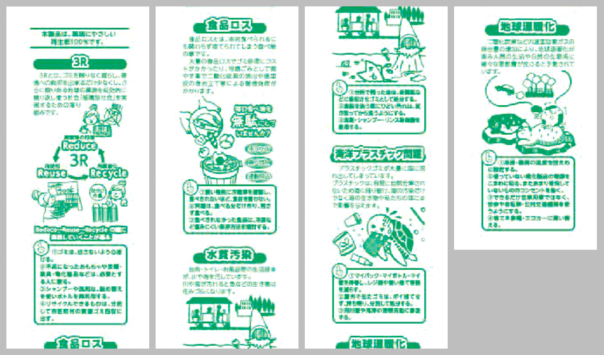環境問題の様々な原因ついての説明がプリントされているトイレットペーパーです。地球温暖化、3R、食品ロス、水質汚染、海洋プラスチック問題と対応策が学べます。