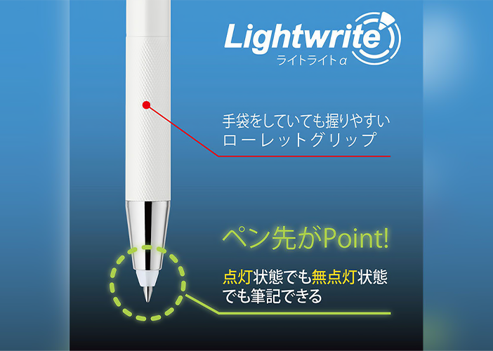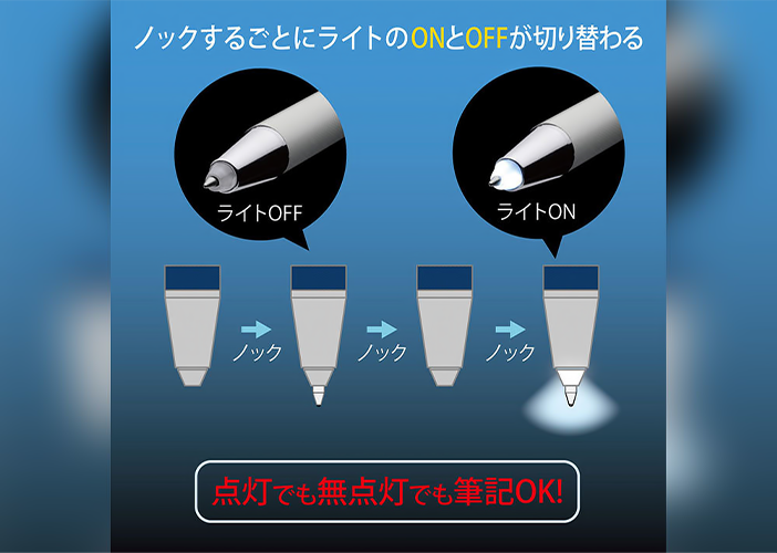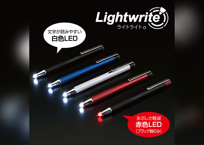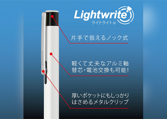 ペン先にライトを搭載し、暗い場所でも光を照らして書けるボールペン「ライトライトα」です。ノックするごとにライトのオンオフが切り替わるので、明るい場所での筆記にも使用できるボールペンです。