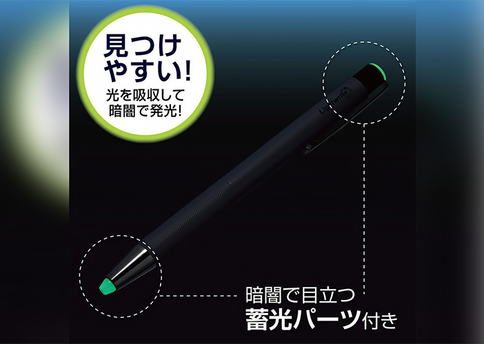 暗いところでもペンが探しやすいように、ペン先とノック部分に蓄光パーツを搭載しています。