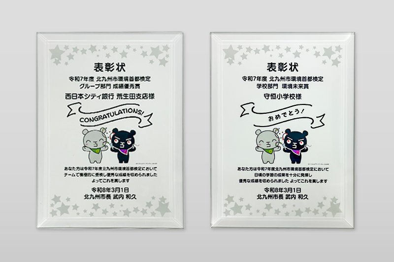 「北九州市環境局 環境学習課様」からのご依頼、オリジナルのクリスタル表彰楯を制作させていただきました。